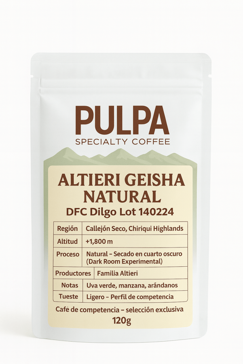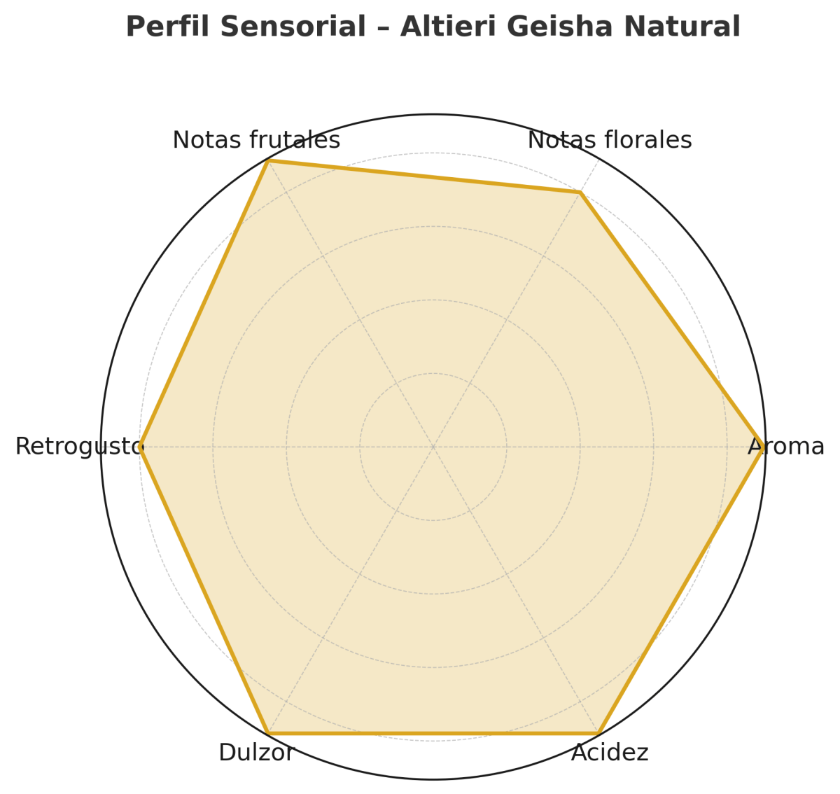 Altieri Geisha Natural es una expresión pura del terroir panameño, elaborada con estándares de competencia. Ideal para métodos filtrados como V60 o Chemex.