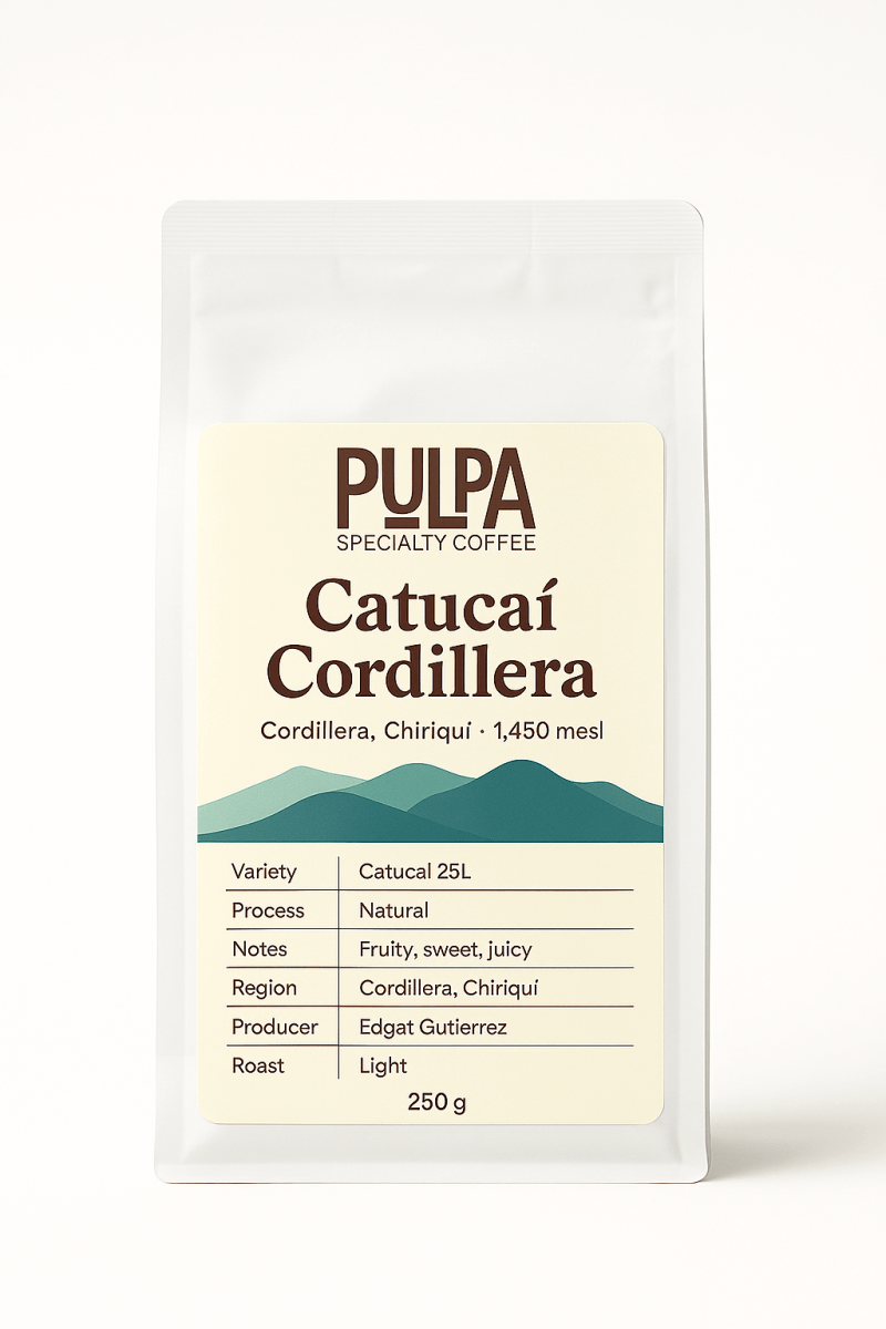 From the lush, misty hills of Cordillera in Chiriquí, Panama, comes Catucaí Cordillera, a naturally processed micro-lot crafted by producer Edgar Gutierrez. Grown at an elevation of 1,450 meters above sea level, this lot delivers a vibrant sensory experience characterized by fruit-forward clarity, smooth sweetness, and juicy complexity. Every cup reflects the care and precision taken from cultivation to harvest to roast, honoring both tradition and innovation in Panamanian specialty coffee.